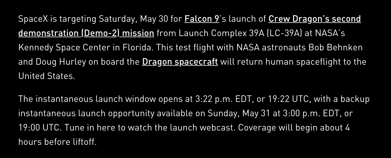 다음 발사 예정 시간은 현지시간(EDT, 동부표준시) 5월 30일 오후 3:22 입니다.