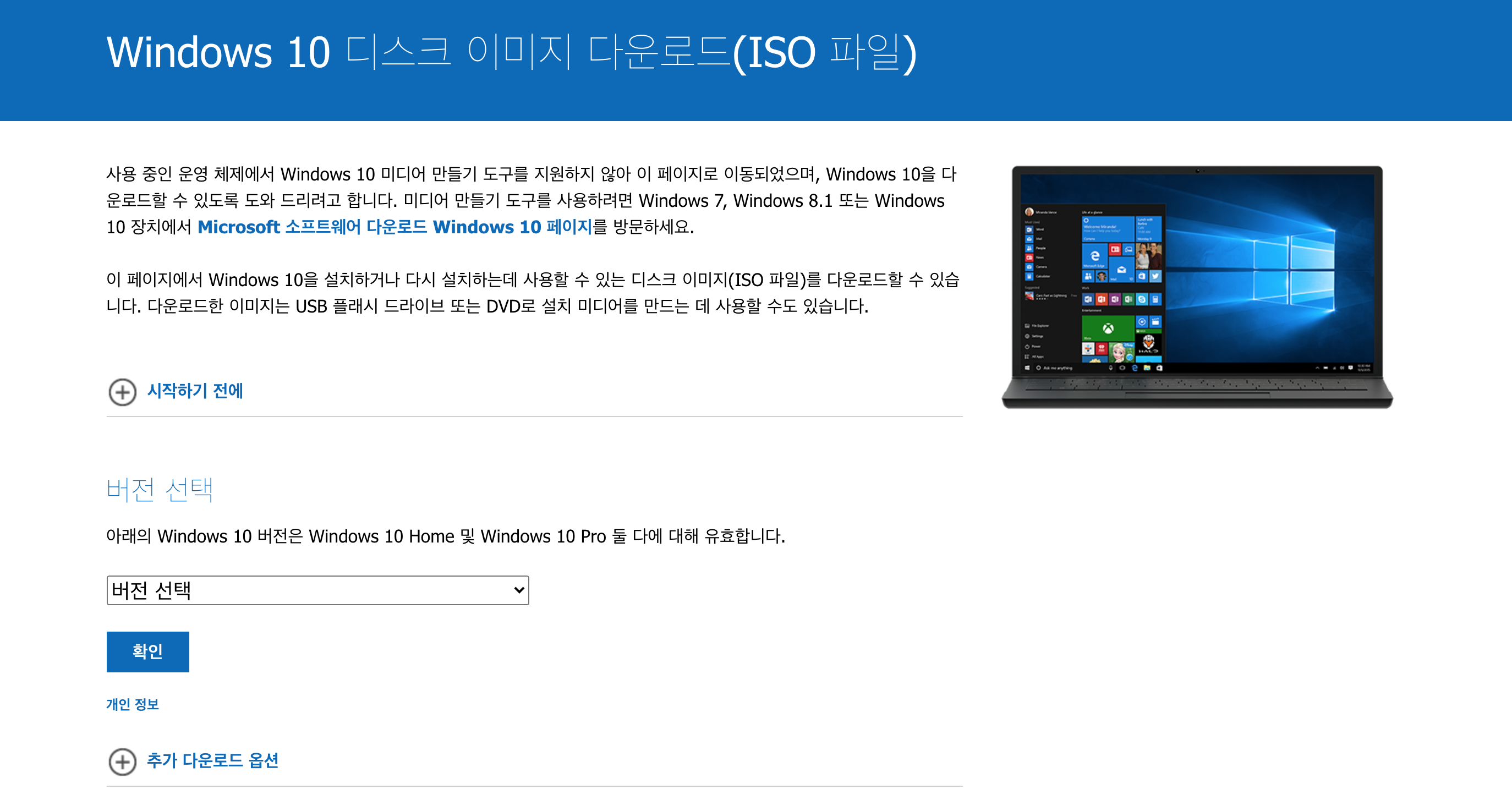 아래는 마이크로소프트 윈도우즈 10 ISO 파일 다운로드 페이지입니다.