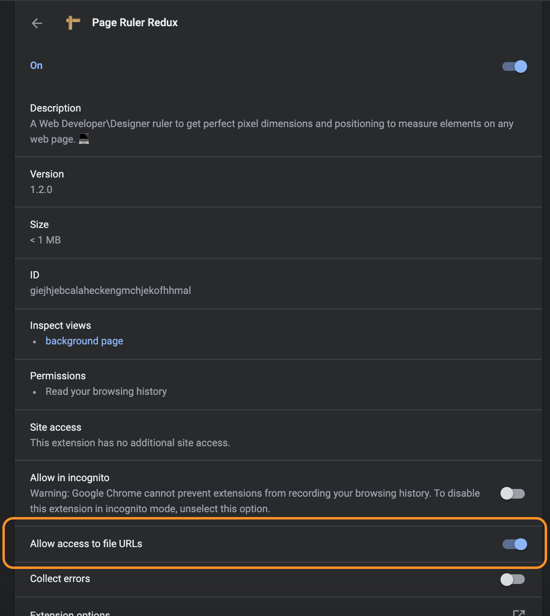 클론코딩을 위해서 다운받아 놓거나 스크린샷을 찍어놓은 이미지를 크롬으로 불러오면 Page Ruler Redux가 작동을 안하는 경우가 있는데, 이런 때는 익스텐션 설정에서 "Allow access to file URLs" 옵션을 활성화해주면 간단히 해결됩니다.