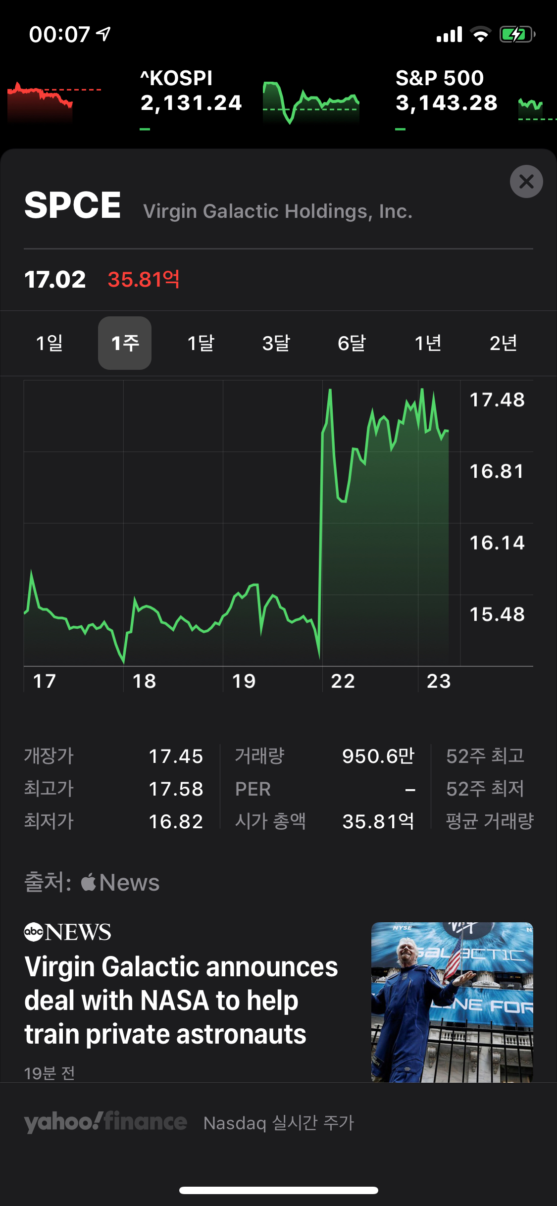 실제로 이 발표 직후, 버진 갤럭틱의 주가는 Virgin Group의 재정난과 Virgin Galactic의 안 좋은 재무재표에도 불구하고 급등했습니다. 폭이 크다고 볼 수는 없지만 거래량이 갑자기 많아졌습니다.