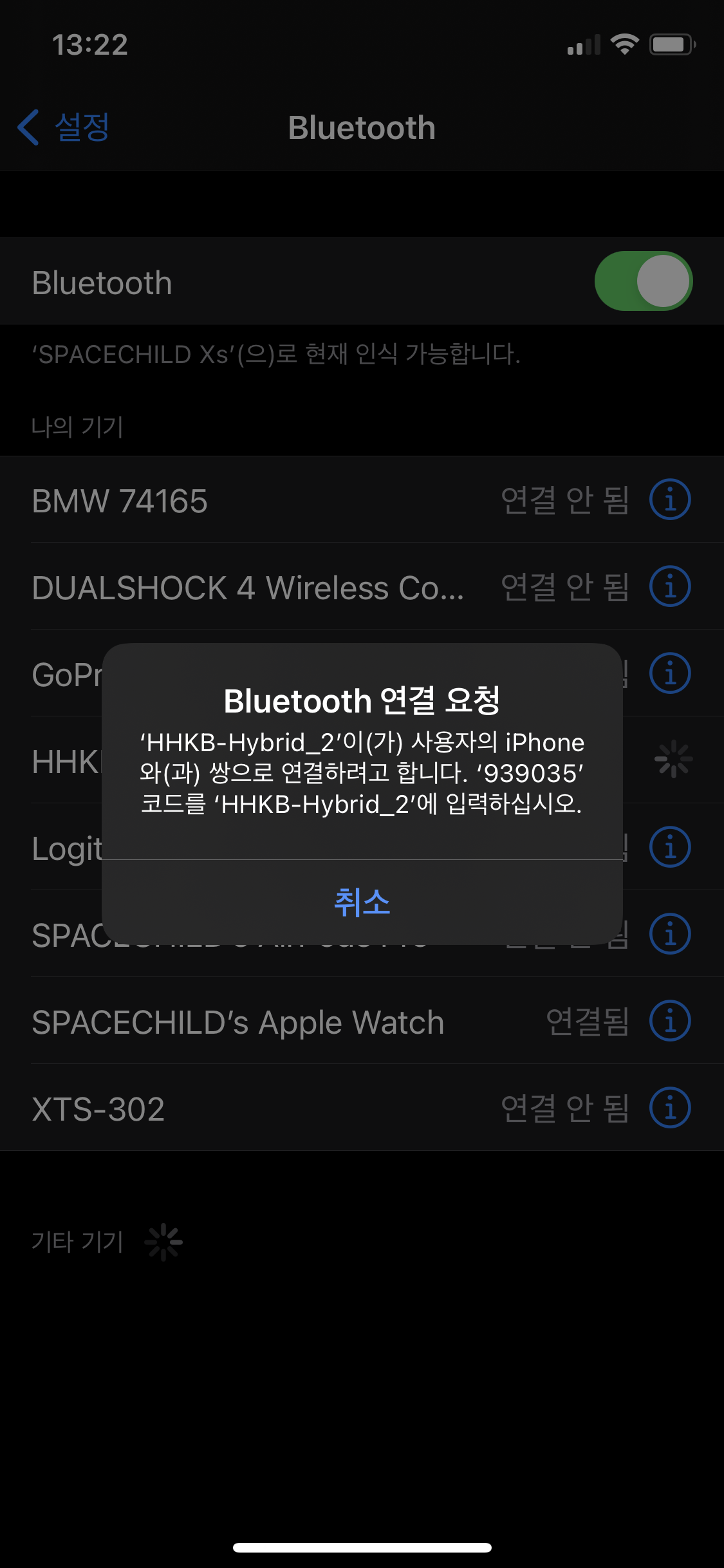 3. 아이폰에서 [설정]  > [블루투스]로 들어가면, 제일 하단에 '해피해킹 하이브리드 (선택한 숫자)'라고 뜹니다. 선택해줍니다.
