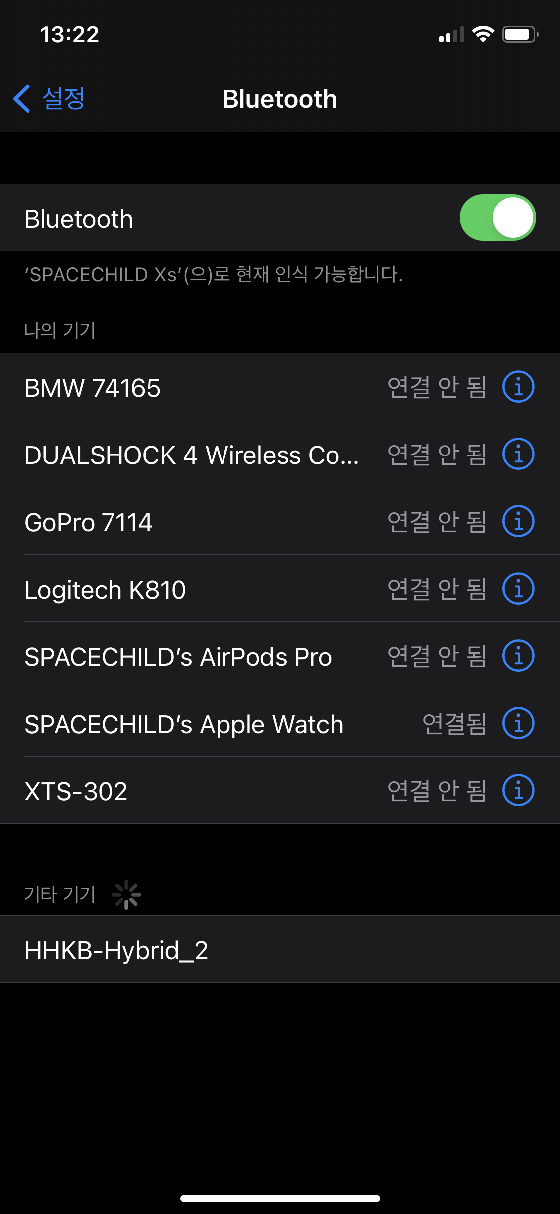 3. 아이폰에서 [설정]  > [블루투스]로 들어가면, 제일 하단에 '해피해킹 하이브리드 (선택한 숫자)'라고 뜹니다. 선택해줍니다.