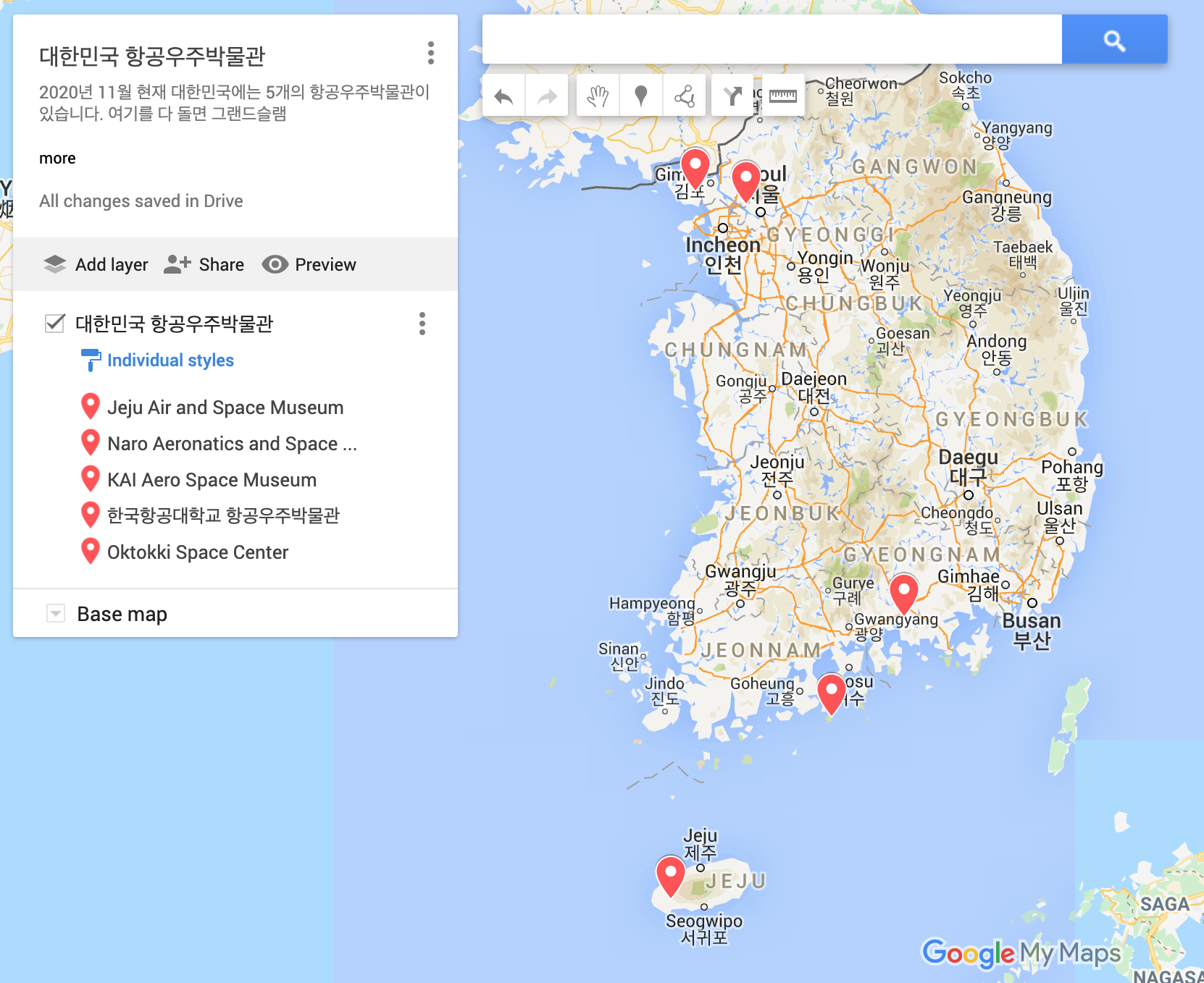 2020년 11월 현재 대한민국에는 5개의 항공우주박물관이 있습니다. 여기를 다 돌면 그랜드슬램 혹시 추가할 곳이 생기면 spacechild7@gmail.com