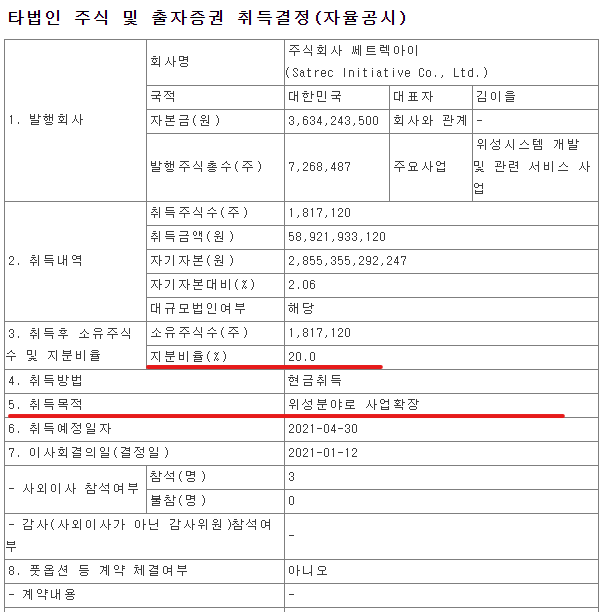 한화에어로스페이스 이번 인수의 목적을 "위성분야로 사업확장"이라고 공시에서 밝히고 있습니다.