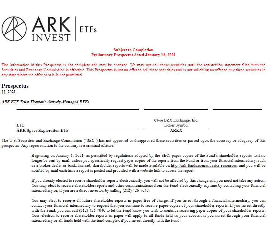 이번에 캐시 우드가 이끄는 아크 인베스트먼트(ARK Investment Management)가 우주개발에 투자하는 ETF를 새로 런칭할 예정이라고 합니다. 오늘 미국 증권거래위원회(SEC, Securities Exchange Commission)에 주식등록신청을 했네요.