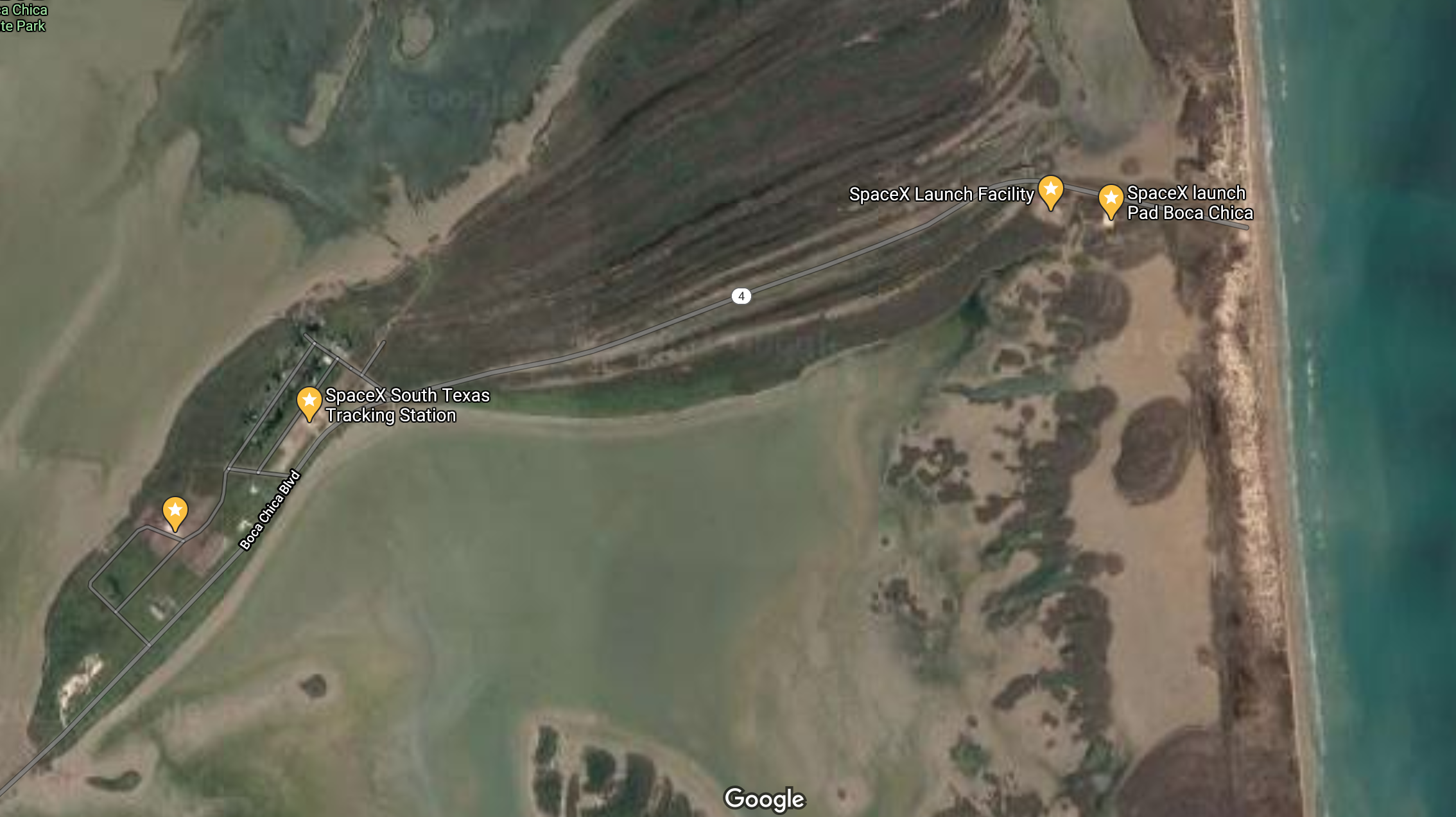 주 도심지를 벗어나 오른쪽에 보이는 보카 치카(Boca Chica) 해변 부근에 스페이스X의 발사장과 관제시설, 그리고 로켓발사장(Launch Pad)가 보입니다. 여기서 스페이스X는 화성으로 사람을 이주시키기 위한 '스타쉽 헤비(starship heavy)' 로켓을 만들고, 테스트 하고 있는 것이죠.