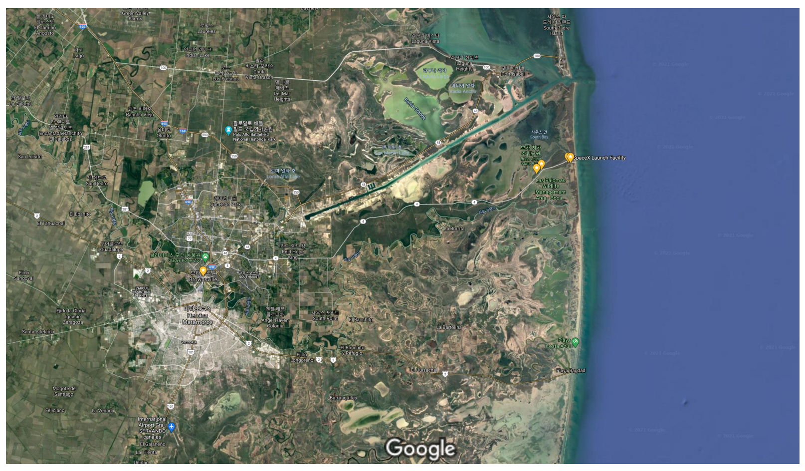 사진 중앙에서 좌측에 있는 노란 점이 브라운스빌입니다. 그리고사진의 좌측 상단에 노란색으로 표시된 곳이 SpaceX의 시설들입니다.