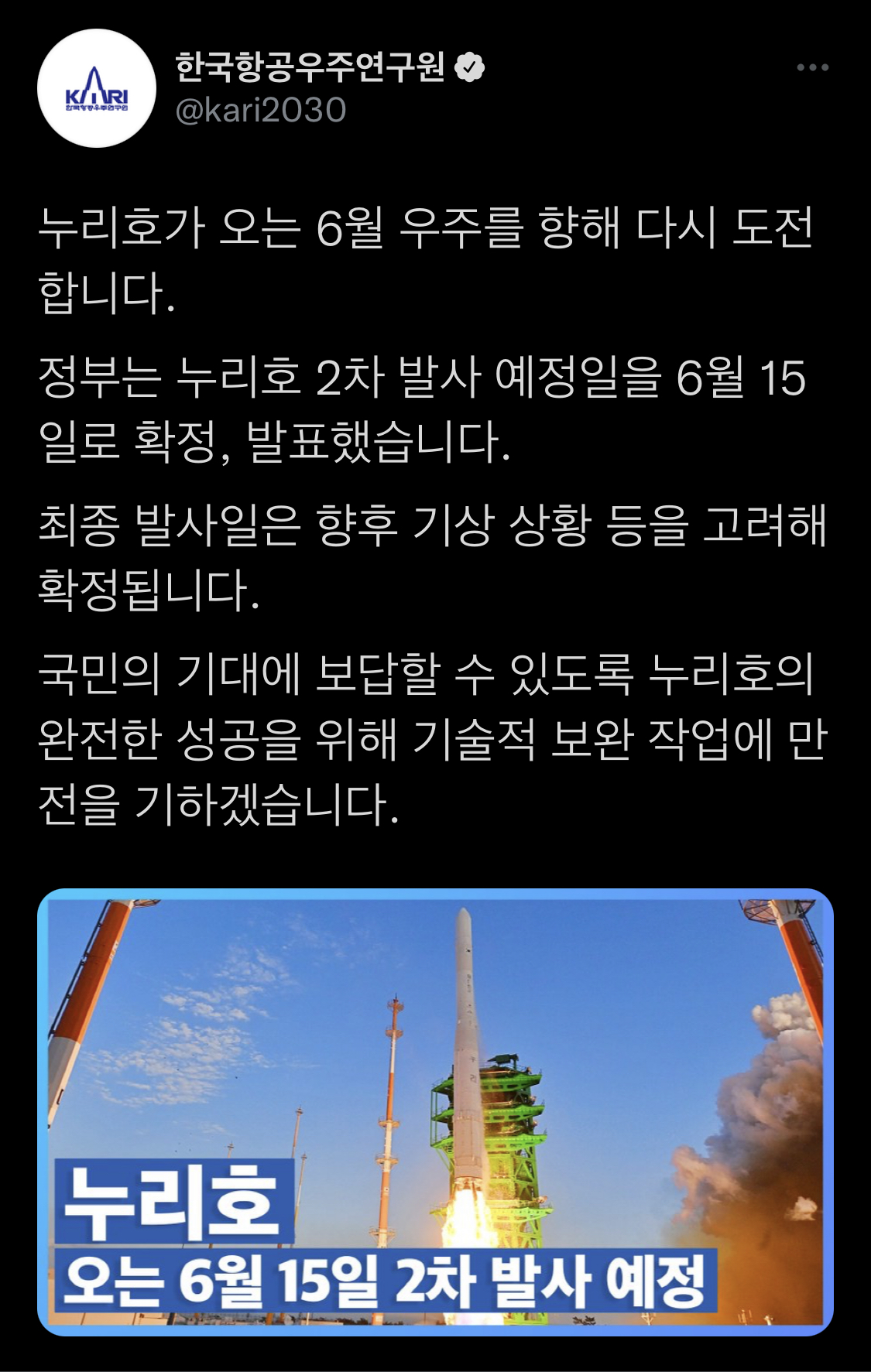 오늘 한국항공우주연구원 KARI가 누리호의 2차 발사가 올해 2022년 6월로 일정이 잡혔다고 공식 발표 했습니다.