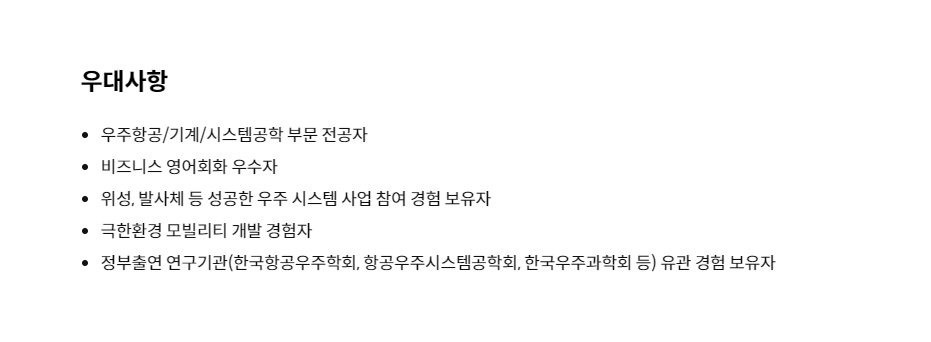 항공우주공학이나 시스템공학, 기계공학 전공자를 우대하는 것으로 되어 있고,