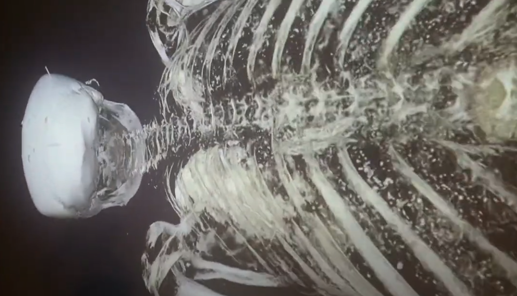 아래는 전시장에서 벽면 전체를 활용해서 대형상영된, 미라의 CT촬영 영상입니다.