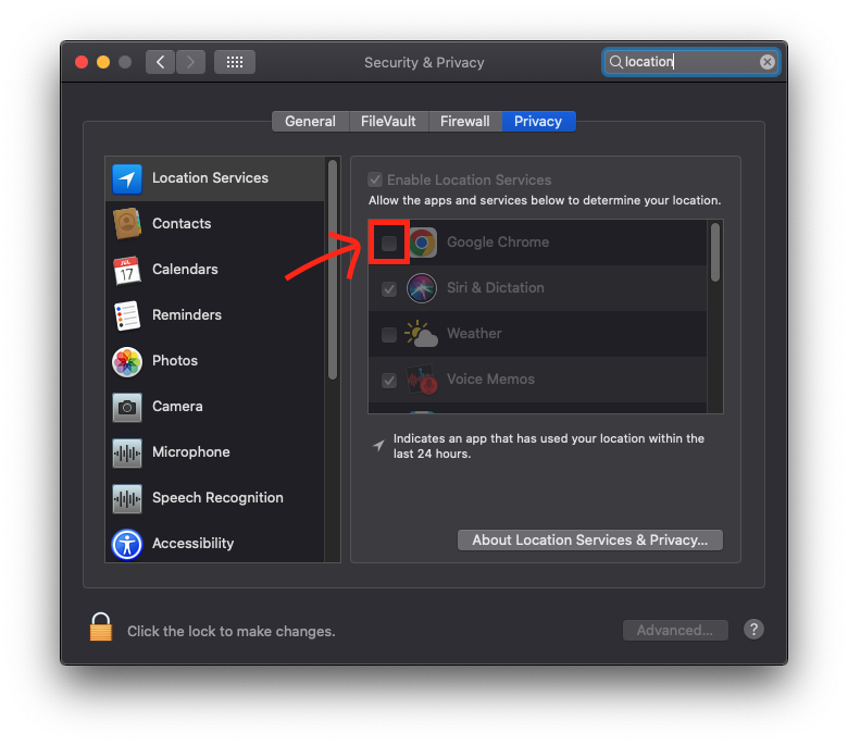 1. 맥에서 구글 크롬에게 위치 정보 접근 권한을 주자.
