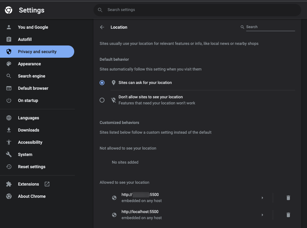 자바스크립트로 브라우저의 위치정보를 불러올 때, 웹에서 '위치에 접근이 안된다('Location access denied')'고 알림이 뜰 때 조치 방법입니다.