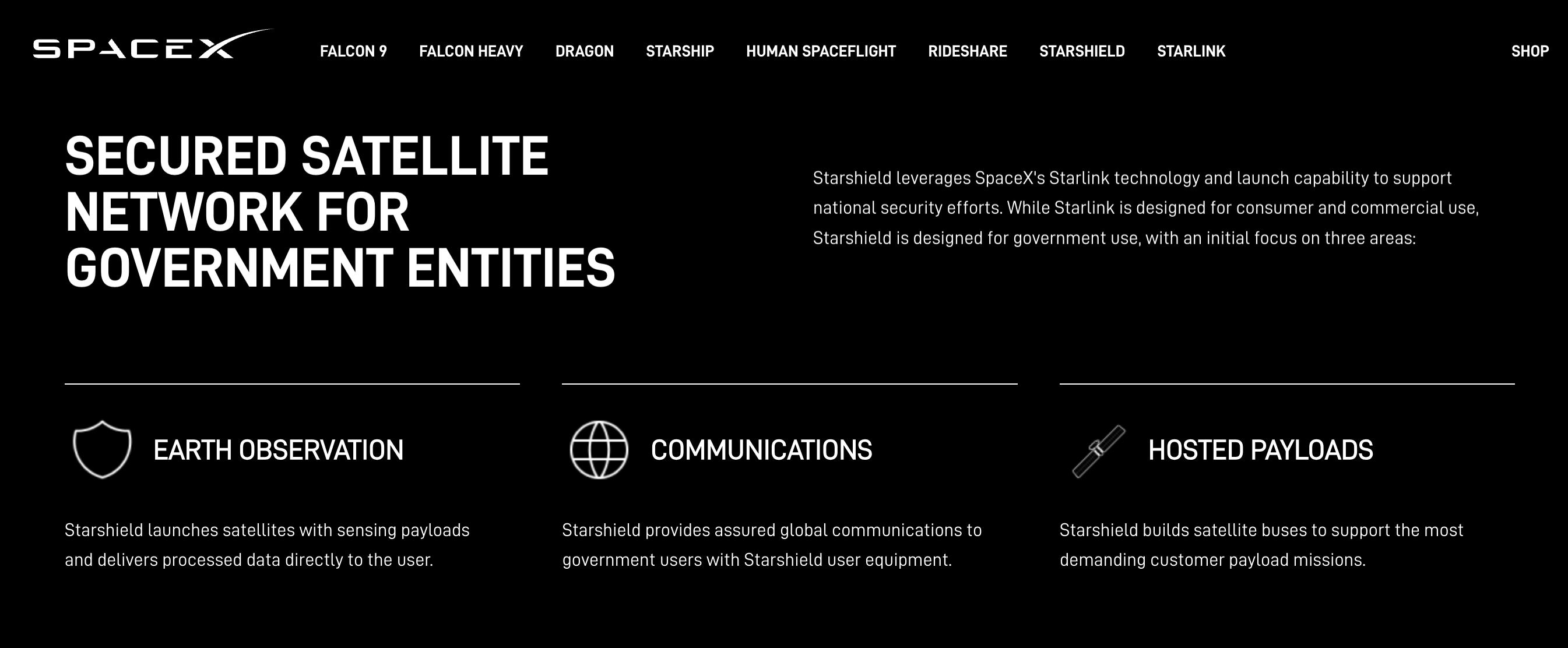 스페이스X의 홈페이지를 가보면, 정부를 위해서 보안된 위성통신망을 제공하고 있다고 되었습니다.