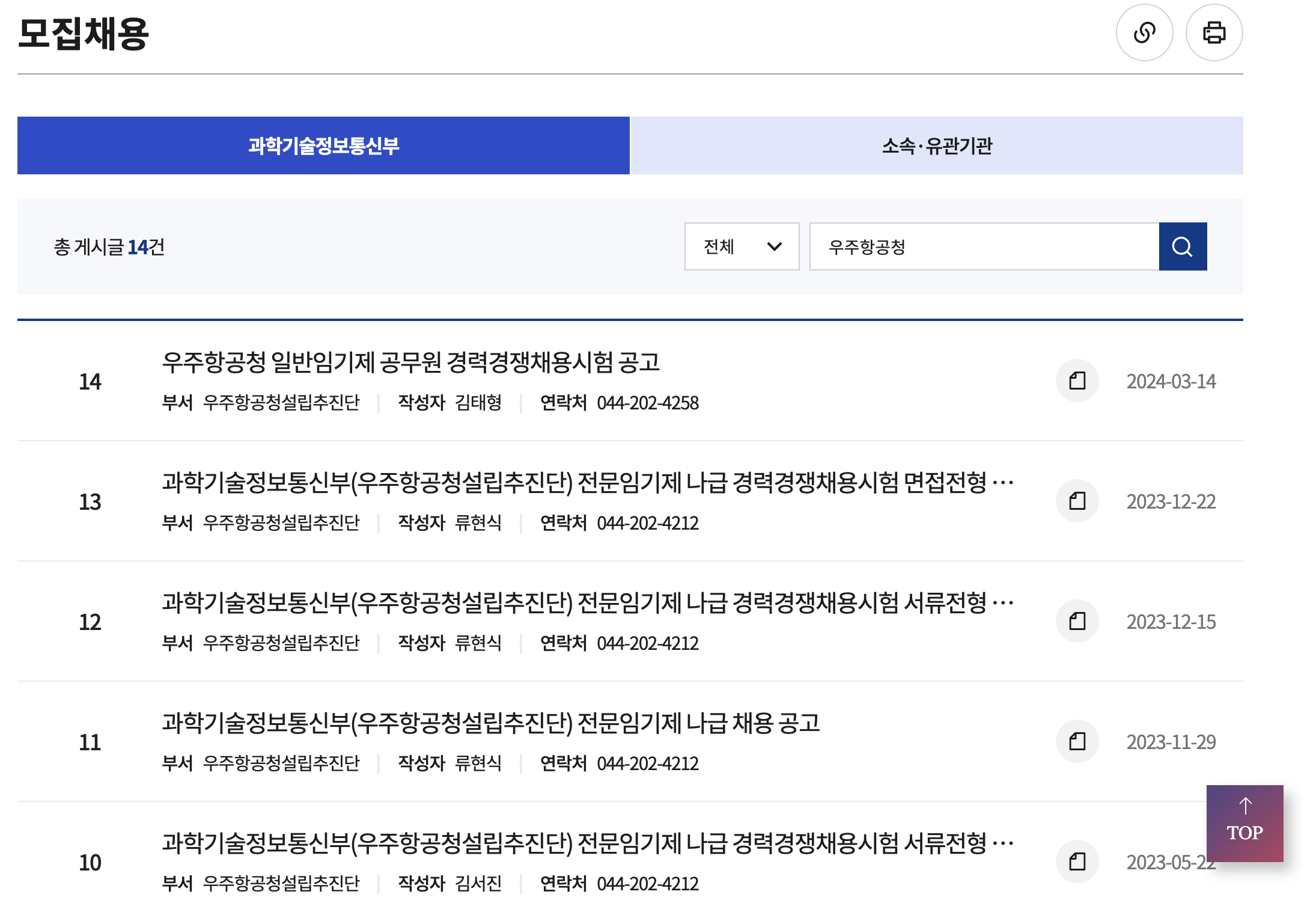 한편, 우주항공청은 작년부터 꾸준히 과기부 홈페이지에서 채용을 하고 있습니다.