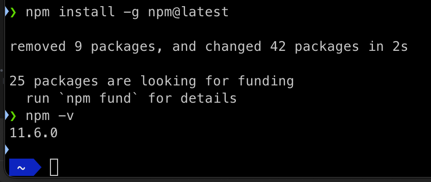 아래 명령어를 치면, 4번에서 확인했던 npm 버전이 달라졌음을 알 수 있다.