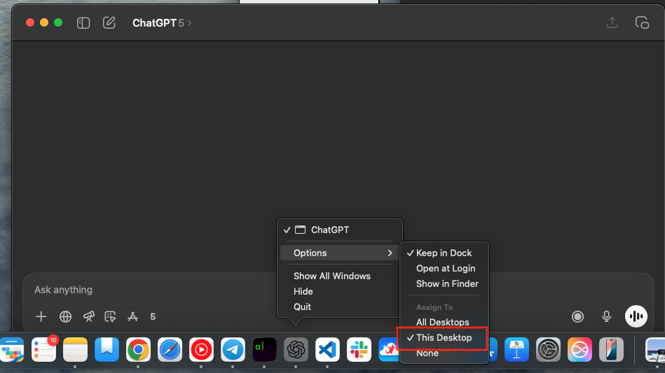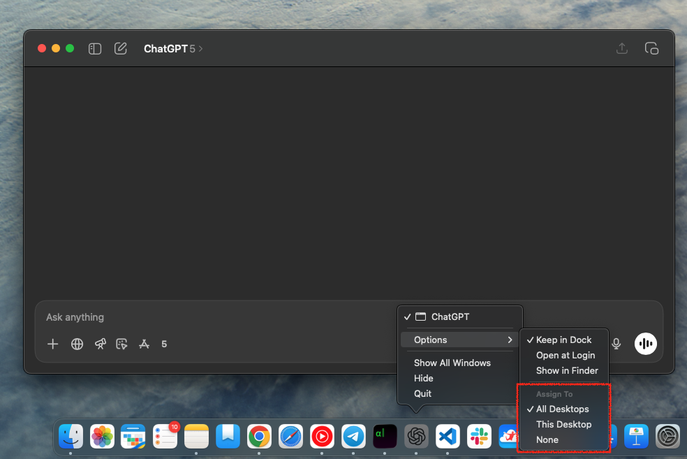 ChatGPT 앱 우클릭 > Options > All Desktops