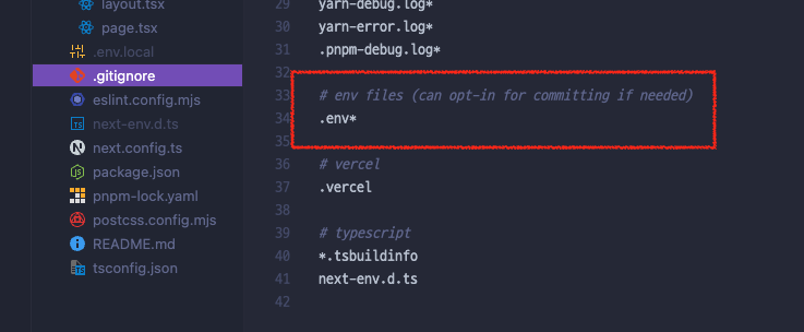 Next.js 프로젝트를 생성할 때, 자동으로 생성되는 .gitignore 파일을 열어보면,